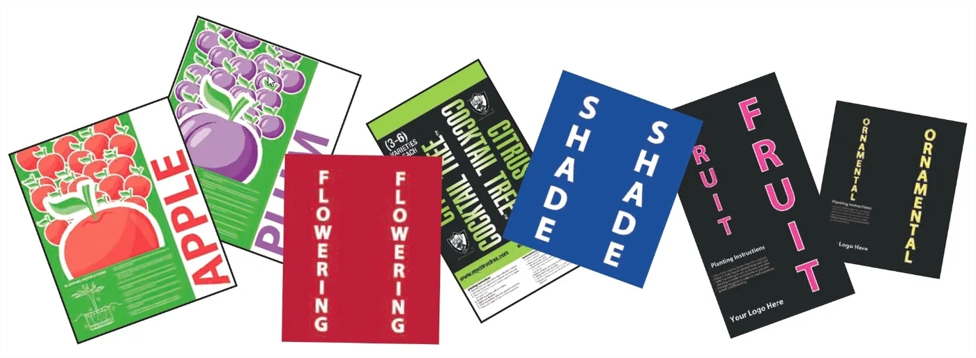Sizes available in 10" x 12" or 10" x 18" printed with up to 3 colors. Add your company logo, care information and planting instructions. Apply to tree by wrapping and staple to itself for a nice high end finished look.